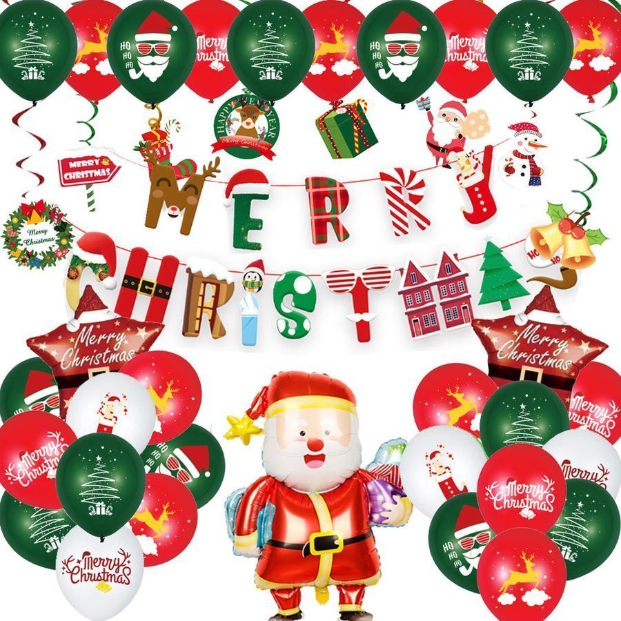 【 セット内容 】サンタさんのバルーン 94cm×73cmMERRY CHRISTMAS のガーランド ( 1文字 19cm×13cm )星型のMerry Christmas バルーン 40cm×38cm 2個緑のバルーン 12個赤のバルーン 12個白のバルーン 4個紙吹雪バルーン 6個吊り下げ飾り8種類