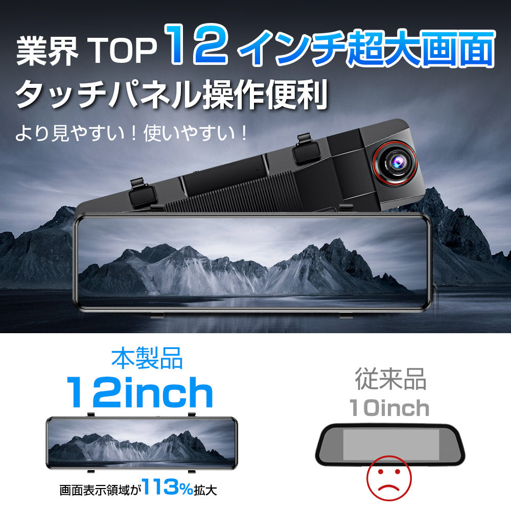 ドライブレコーダー ミラー 12インチ フルタッチパネル SONYセンサー 2K(1440P) FHD高解像度 GPS搭載 電波障害対策済 170度広角視野 敬老の日 プレゼント