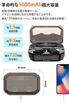 電池残量をLEDスクリーンに数字で表示、バッテリー残量が一目で確認できます。 5000mAh磁石式でカチッと充電できる収納ケース付き、ケースをフル充電することでイヤホ ンを充電ができ、合計最大150時間ご利用することができます。