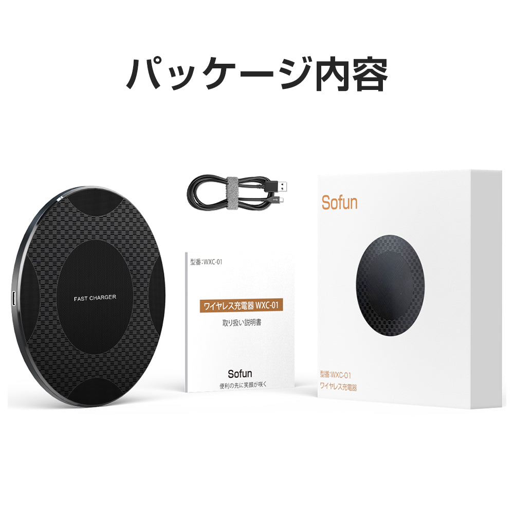 ワイヤレス充電器本体*1、USB Type-Cケーブル*1、日本語取扱説明書。