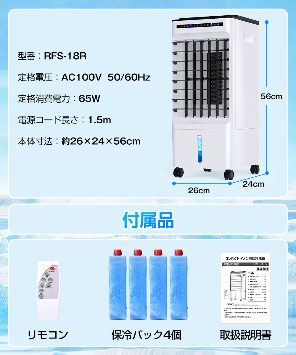 商品仕様●商品名称:冷風扇●製品品番:RFS-18R●水タンク容量:5L●定格電圧:AC100V●電源周波数:50/60Hz●定格消費電力:65W●重量:3.6kg●サイズ:24*26*56cm●電源ケーブル長さ:1.5m