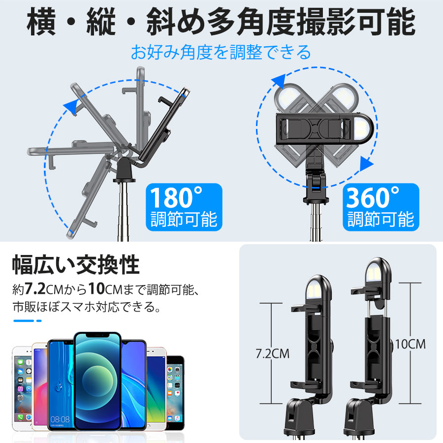 【調節可能LEDライト付き】自撮り棒 セルカ棒 三脚 リモコン付 コンパクト(ZPG-A17)