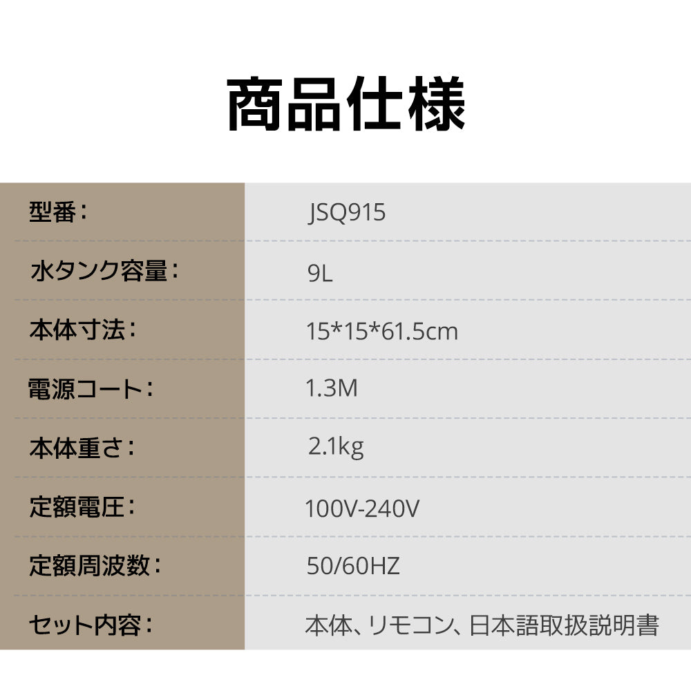 9L大容量 加湿器 上部給水 静音 アロマ対応 W除菌 AI恒湿 タイマー付 リモコン付き タワー型(JSQ-915)