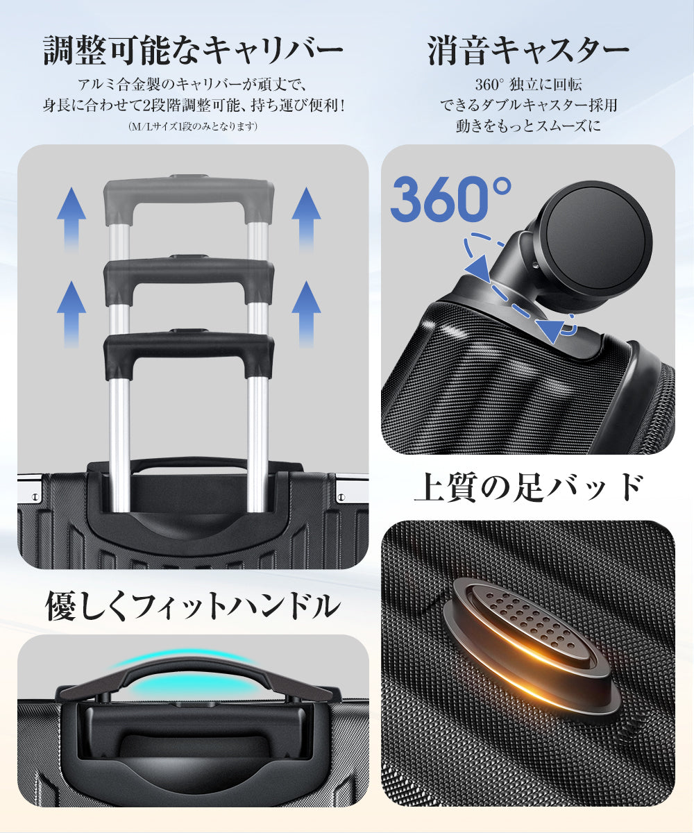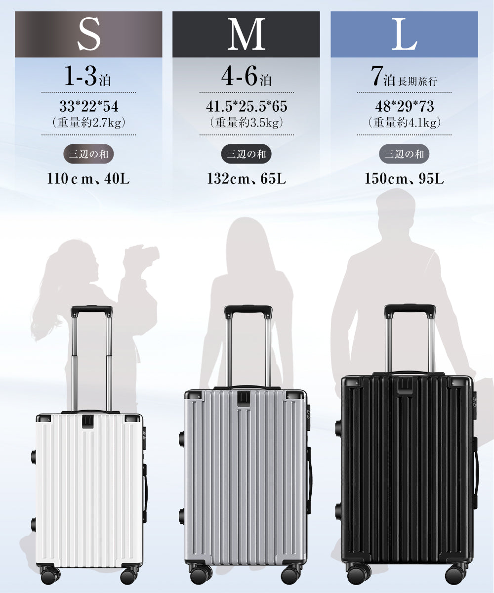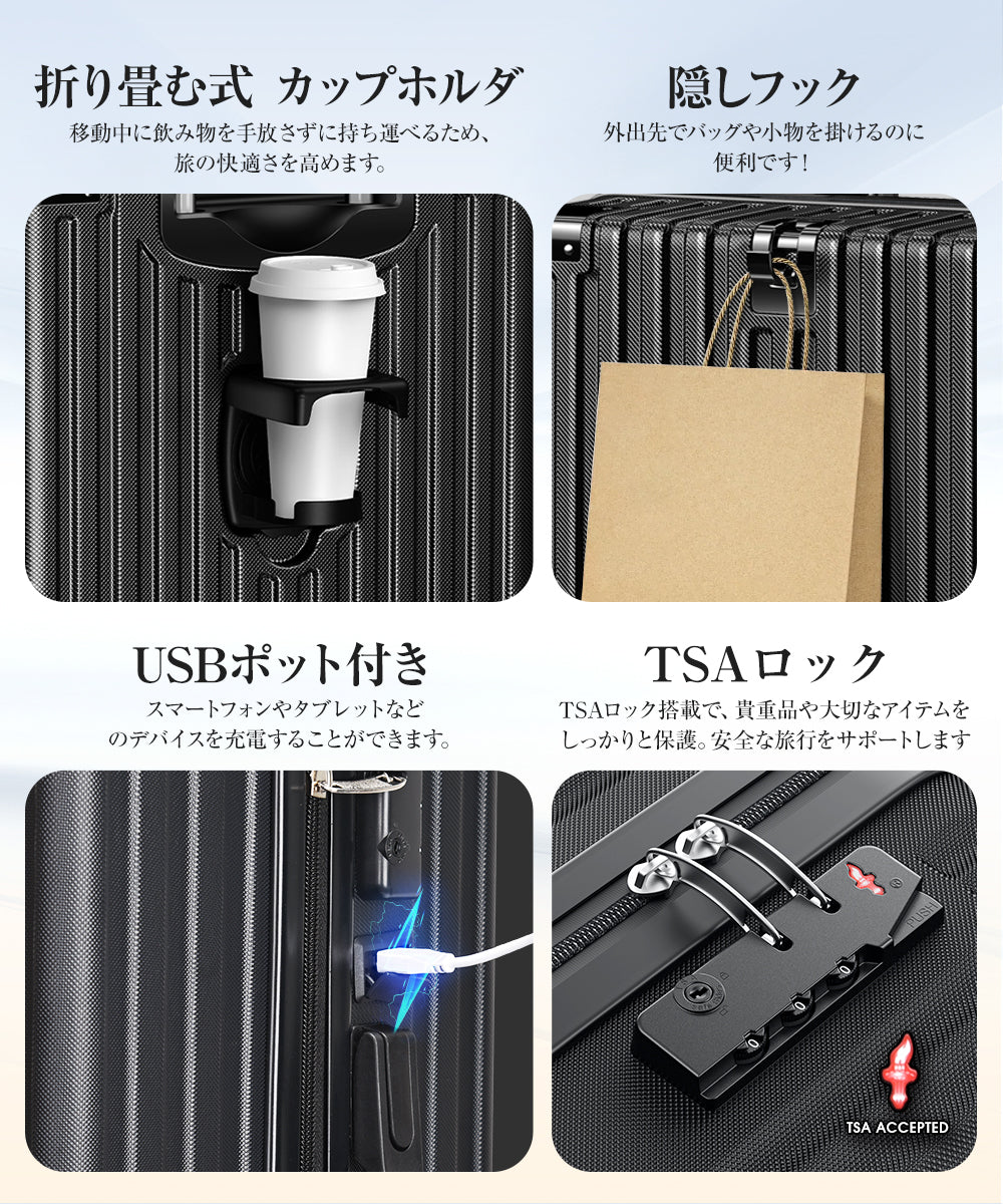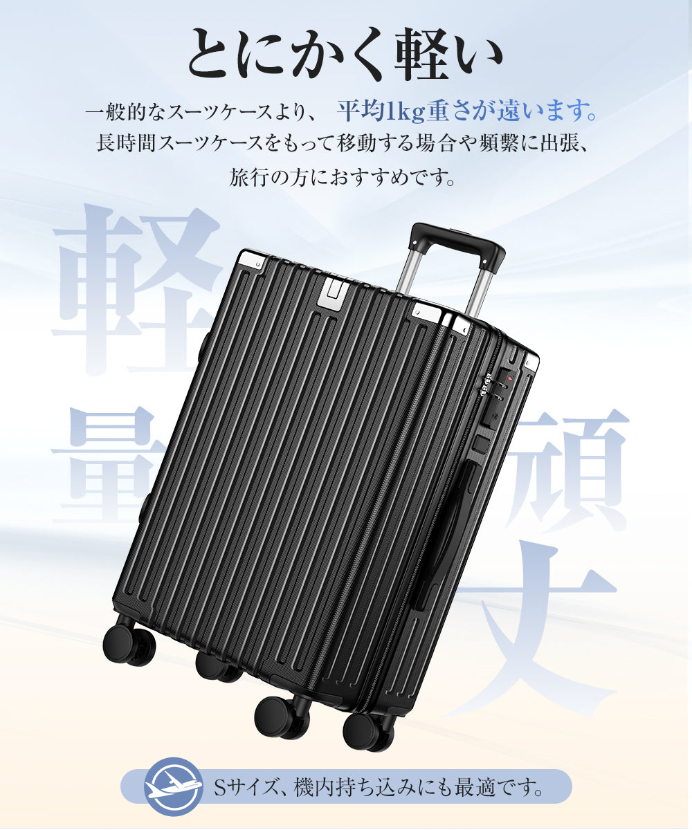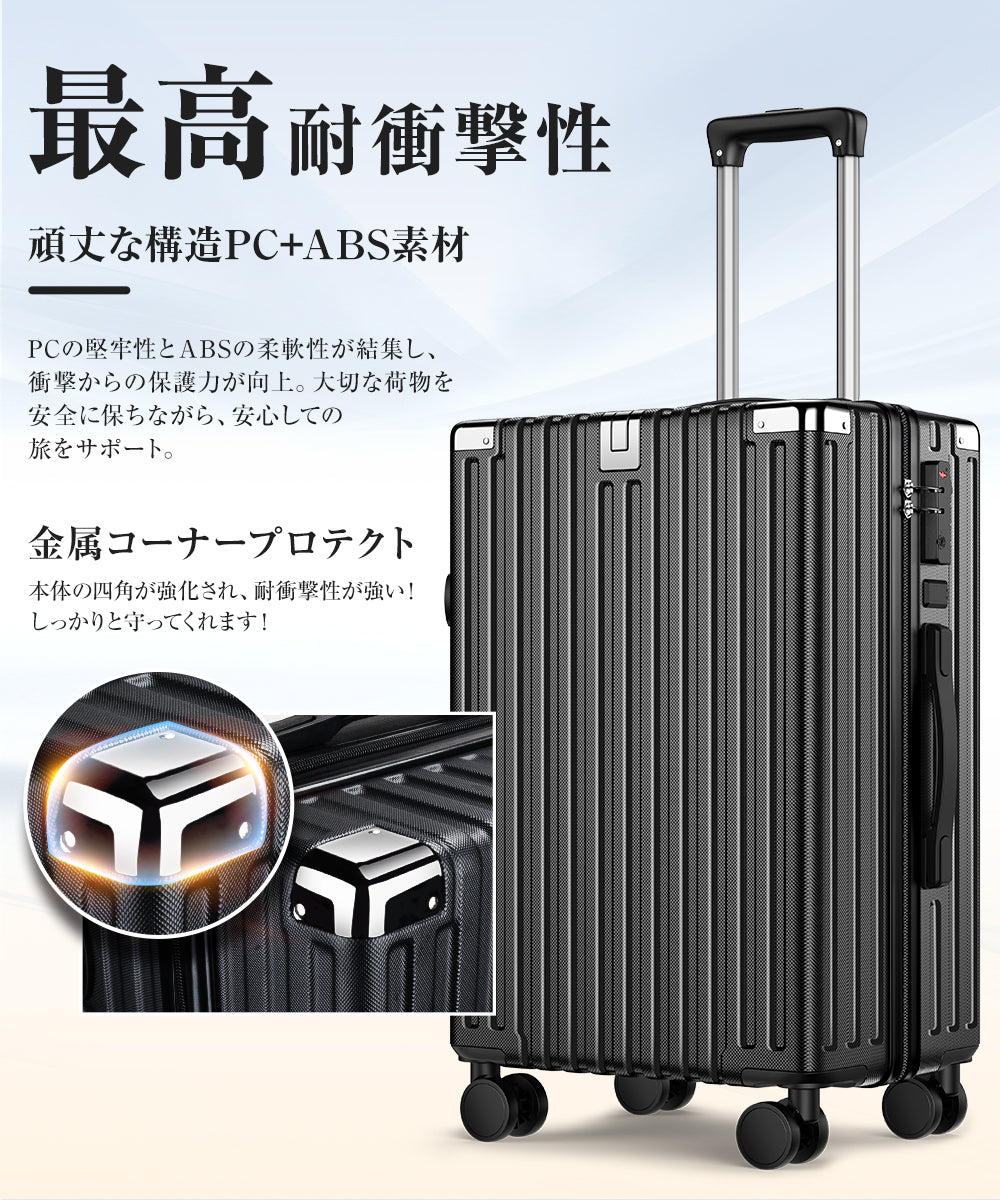2025神コスパモデル新登場!市販最軽量+多機能付き、さらに手頃値段!【最新軽量モデル・大容量】落ち着いたカラー、縦縞デザインにより、シンプルかつファッションです。業界高品質スーツケースを目指し、安い値段で抑えられ、何よりコスパ良し!男性だけなく女性の簡単に持ち上げるの軽量なキャリーケースです。さらに、メッシュポケット内蔵され合計4箇所メイン収納があります。大容量なスーツケースは収納便利、旅行や故郷帰りなど最適なスーツケースです。